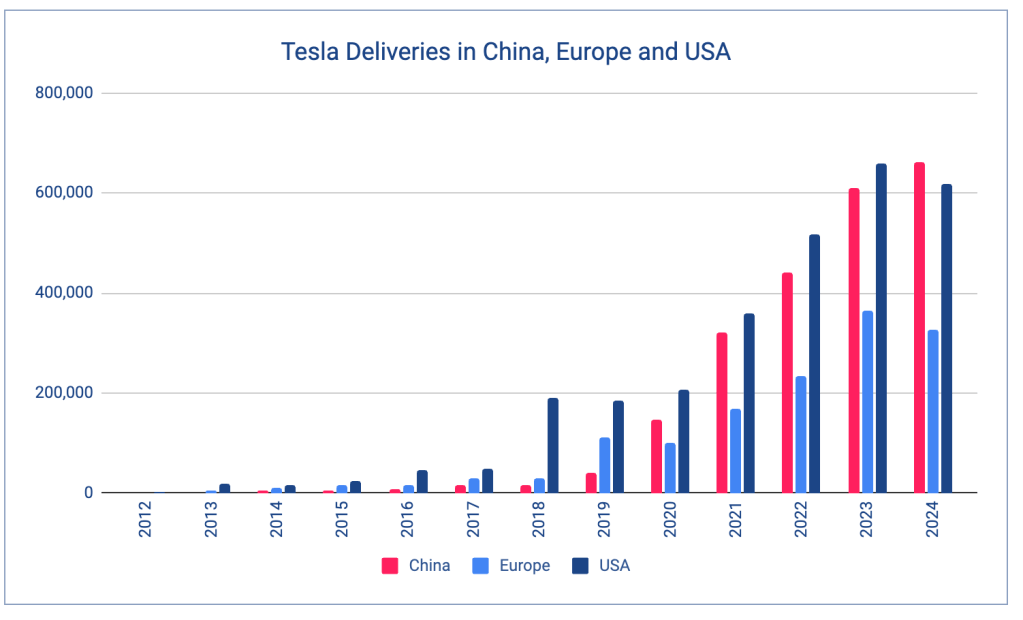 - 中国方面,特斯拉面临来自比亚迪的激烈竞争。2024年,比亚迪纯电新车销量达176万辆,基本已经接近特斯拉。