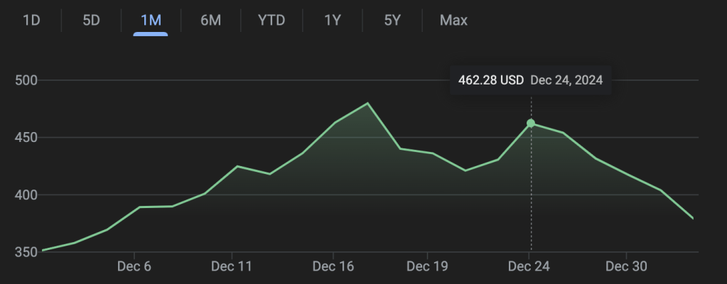 自FOMC,以及“Santa Rally”前半周强势反弹后,TSLA股价已从最高点下跌超20%,正式进入“技术性调整”。当然,我们因为本不看好Santa Rally而在上周二逢高减仓,并且也持续卖出了一些上周五和本周五到期的行权价在450左右的看涨期权,一定程度上弥补了损失。这些期权的细节可以参考持仓信息,每期日报最后“我的操作”部分,或者群内TSLA主题。