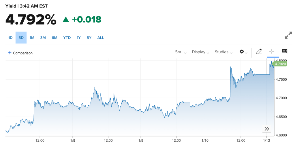 虽然NFP中,超过10万的就业来自政府;虽然服务业存在不可忽视的假期季节性因素;虽然这个数据大概率会被下修甚至有“造假嫌疑”,但数据一出,10年期国债收益率依然瞬间飙升至4.75%以上,直逼5%。三大指数应声下跌,其中纳斯达克跌1.63%,SPY跌1.53%。在货币利率利差驱动下,美元指数继续走强,DXY上涨突破110,这是2022年11月以来的首次。