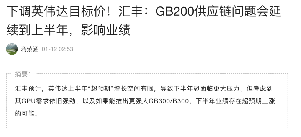 - 汇丰银行预计,英伟达的GB200的问题将持续到2026财年上半年(2025年2月至2025年7月),限制NVIDIA在上半年实现“意外”增长的潜力,同时在下半年(2025年8月至2026年1月)将面临更大的压力。他们同时将英伟达2026财年的每股收益(EPS)预测下调了6%。
