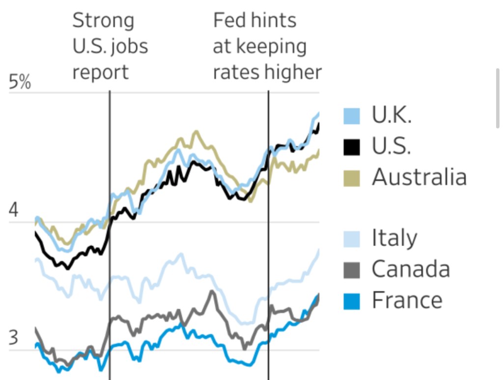- 从长期来看,好于预期的就业数据,外加美联储“第二阶段”的突然转向是10月份以来10-yr bond yield上涨的罪魁祸首。这实际上也引发了全球范围内各国国债这一轮的收益率上涨。