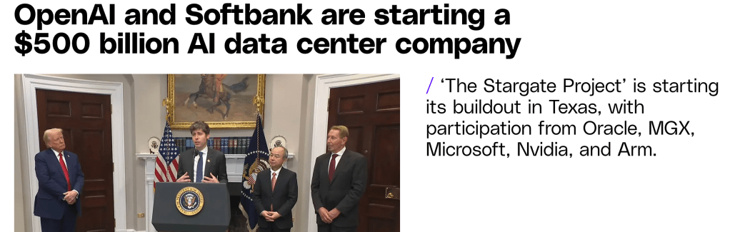 除了币圈,周二引发市场剧烈波动的还有孙正义。自从一个月前会见特朗普,给出对美国进行1000亿 AI投资的许诺后,软银集团CEO孙正义今天携手OpenAI总裁Sam Altman,在总统发布会和特朗普一起宣布了名为“Stargate”的人工智能投资计划,投资总额高达5000亿,大超市场预期,也远超特朗普一个月前作为“谈判艺术”脱口而出定下的2000亿目标。