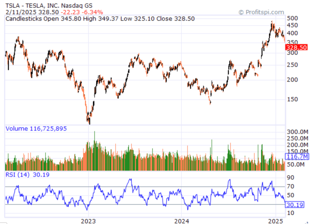 大家好,今天是2025年2月12日星期三。今天紧急加更一期,原因很简单:在我们周末“宣告”特斯拉将不可避免的进入下降通道之后,拉子就一路猛跌。周一,原本中午还算温和的反弹却因马斯克收购OpenAI的意外消息而大跌3%;周二,在基本面利空消息的催化下,空头借机发力,特斯拉续跌7%;周三盘前继续下探约2%。该股竟在短短一周之内,从390径直跌向320大关,跌幅达20%。