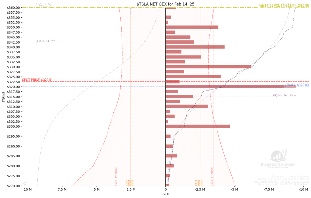 - 从支撑上看,股价已经回补320缺口,下一步应该在311附近找到支撑——这是大选周冲高后股价回落的第一个反弹位置,再下一个支撑是300。如果跌破300,那就有点像2024年12月的Gamma Squeeze,Sky is the limit,只不过方向相反,做多的Squeeze变成了做空,无人敢言底。