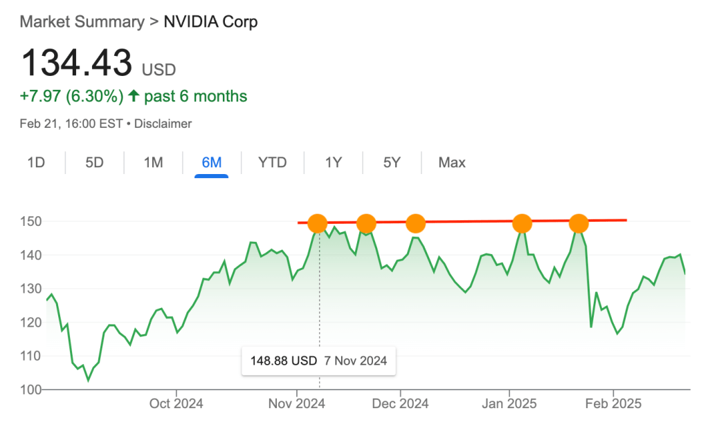 - 上图可知,NVDA的长期阻力位应在150。从24年10月份以来,该位置已经可以说是五攻而不破了。这充分表现出华尔街对NVDA未来营收增速的担忧,以及对Blackwell问题频发萌生的不满——最近一次反弹甚至都没能突破140。如果我是散户,我绝对不会去买Call博弈NVDA盘后超过150的。