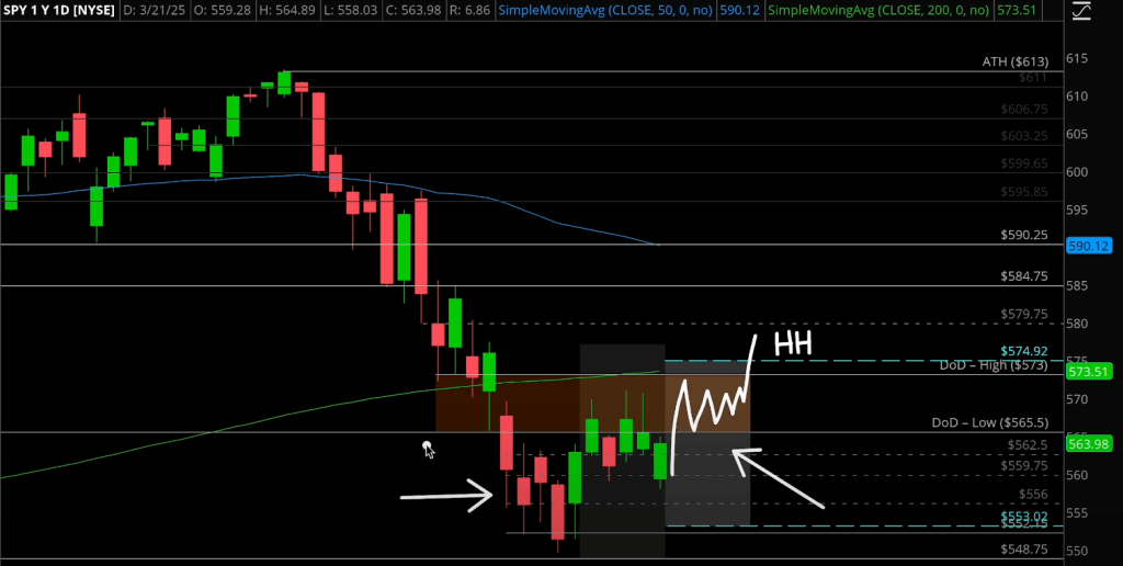 从技术面看,SPY确实存在反弹需求;首先在过去两周,SPY日线级别构成了一个Higher Low,如果能突破574跃过死区形成一个Higher High,将能正式确认反弹。但即便如此,涨幅恐怕也是有限的。首先,前期S/R Zone 580就将是一个极大的阻力。