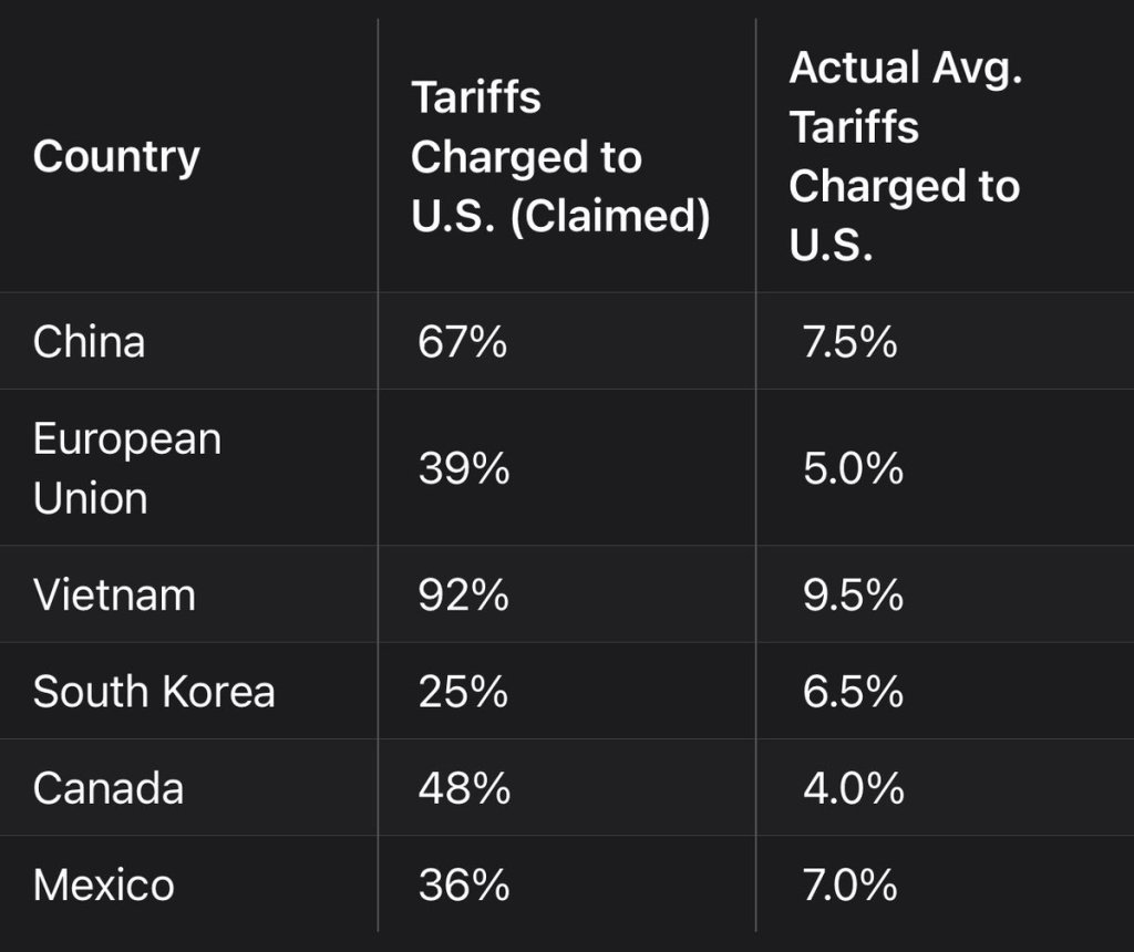 这根本不是什么有效关税,这其实是两国之间的“贸易逆差”。所谓对等关税,指的是在该国对美国的贸易总量中,有多少份额是美国“吃亏”。特朗普这所谓的“对等关税”大棒,打的根本不是对方给美国增加的“不平等关税”,而是在单纯的惩罚贸易本身。