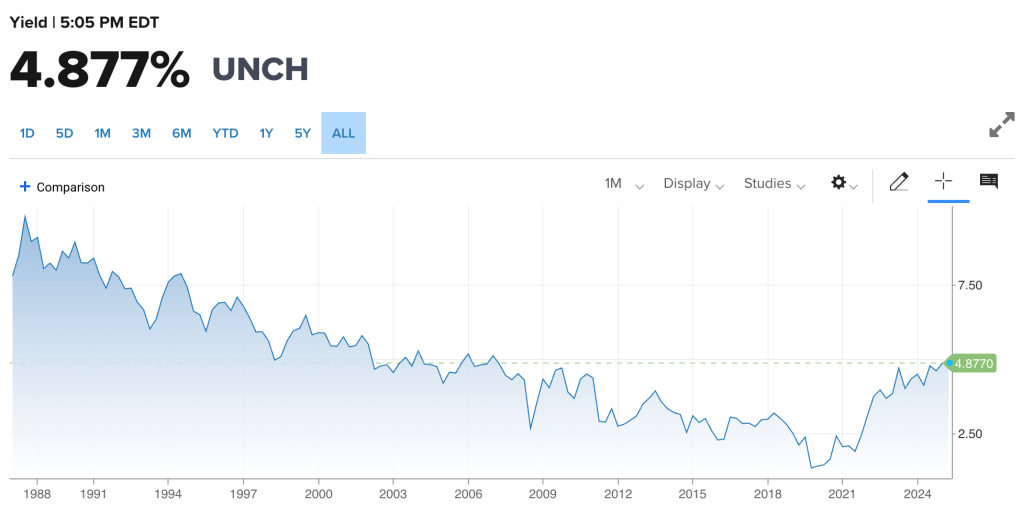 截止周五,DXY收99.83,依旧低于100水下;30年期国债收益率收4.87%,处于高位;房屋抵押贷款利率近年来再次回升至7%以上,压力即将传导到房地产这边。