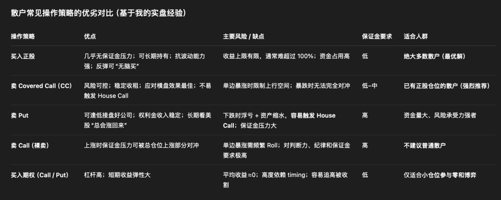 对大多数散户而言,卖Covered Call(CC)才是最稳妥的选择。它是应对横盘、降低优质股票持仓成本的最佳方式,例如英伟达。我目前通过卖CC的方式管理的正股主要包括INTC、AMD等。根据我的自身经验,现将我对散户不同策略的看法总结如下表: