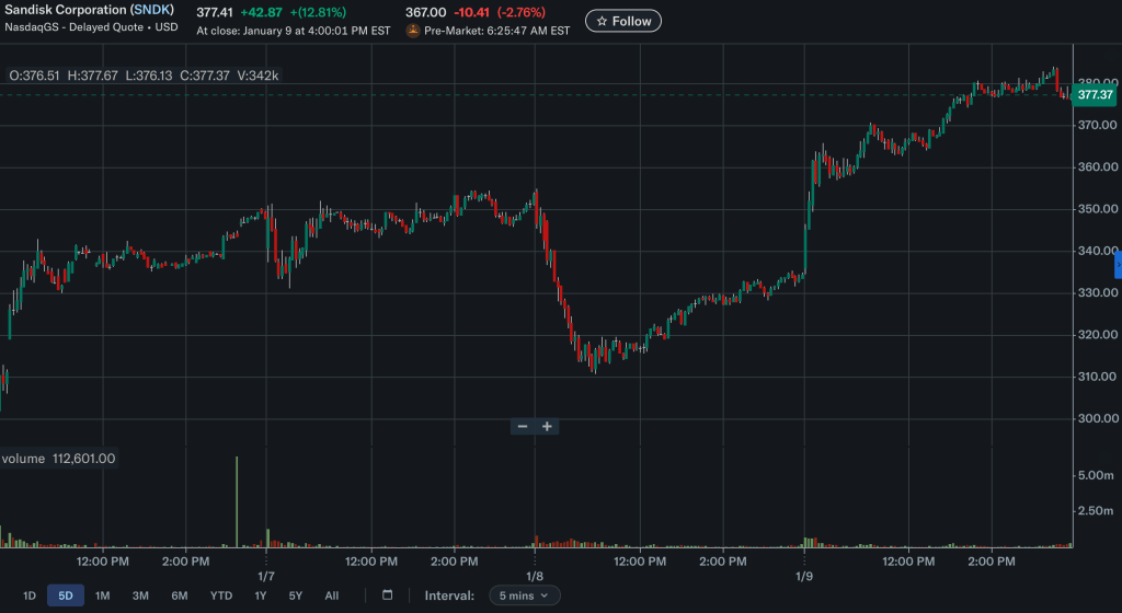 从该股最近几周看涨期权的成交结构以及顶部技术形态缺失的情况来看,SNDK的涨幅大概还会持续。值得关注的是每周五最大成交的Call Option行权位置,和本月底即将公布的25年四季度财报。如果真的要跑路,财报日可能才是多头撤退的deadline。在此之前,如果多空博弈激烈,SNDK也可能宽幅震荡并维持横盘。但我个人觉得,要想再让SNDK一个月内跌回300的难度已经很大。